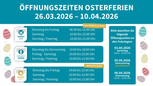 Am 18. und 25. März steht das Sportbad in der Zeit von 17:00 – 20:00 Uhr und am 24. März in der Zeit von 19:00 – 21:00 Uhr nur eingeschränkt zur Verfügung.